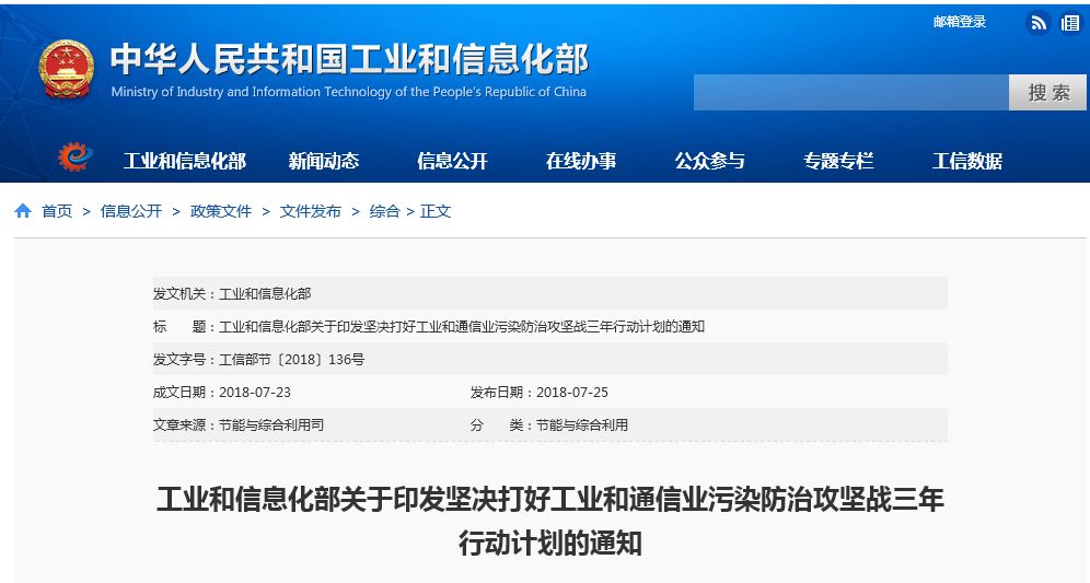 7月25日,工业和信息化部发布《坚决打好工业和通信业污染防治攻坚战三年行动计划》。行动计划旨在全面推进工业绿色发展,坚决打好污染防治攻坚战,促进工业和通信业高质量发展。
