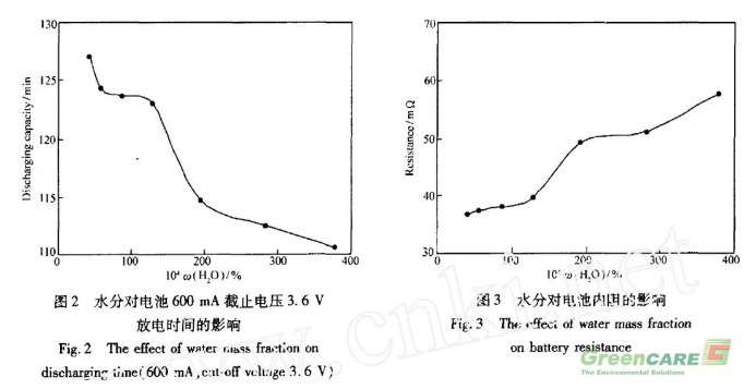电池水分对电池600 mA截止电压316 V放电时间的影响: